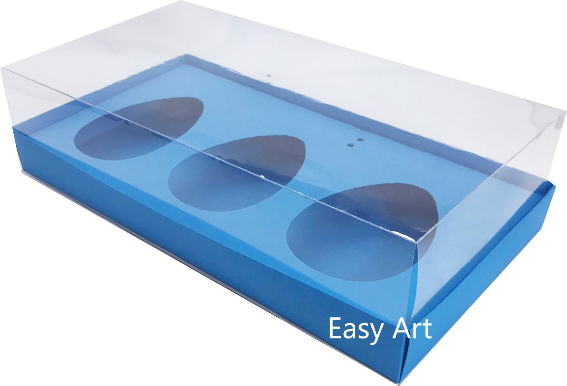 Caixa para ovos de páscoa de colher com berço interno para acomodar 3 metades de ovo de páscoa de 150g e furos para fixação da colher.