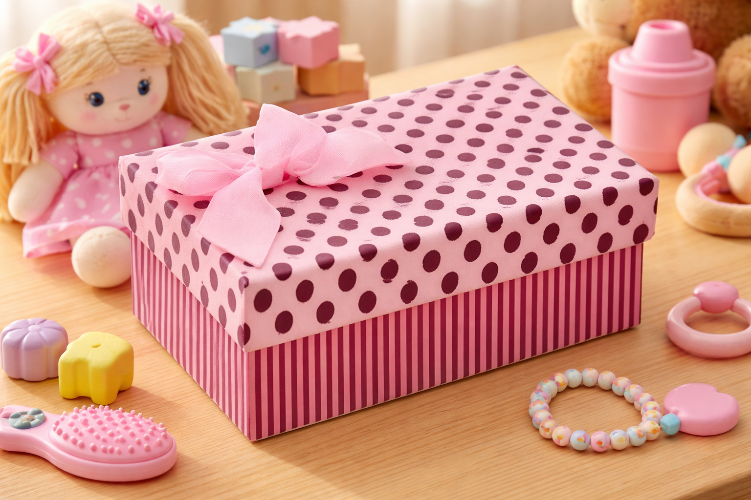 Detalhe: Laço de fita em Gorgurão rosa claro.