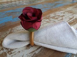 Porta guardanapos confeccionados com flor em tecido engomado e tingido e argola de madeira.