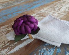 Porta guardanapos confeccionados com flor em tecido engomado e tingido e argola de madeira.