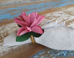 Porta guardanapos confeccionados com flor em tecido engomado e tingido e argola de madeira.