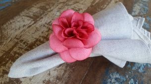 Porta guardanapos confeccionados com flor em tecido engomado e tingido e argola de madeira.
