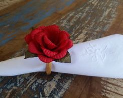 Porta guardanapos confeccionados com flor em tecido engomado e tingido e argola de madeira.