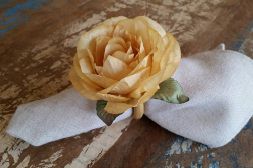 Porta guardanapos confeccionados com flor em tecido engomado e tingido e argola de madeira.