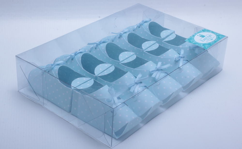 Caixa em PVC cristal transparente contendo 10 sapatinhos.